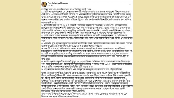 পোস্টে সায়মা মাসুদ মোমো ওই শিক্ষার্থীর সম্পর্কে একটি দীর্ঘ পোস্ট দিয়েছেন। ‘সবার দেশ’ পাঠকদের জন্য স্ট্যাটাসটি তুলে ধরা হলো-