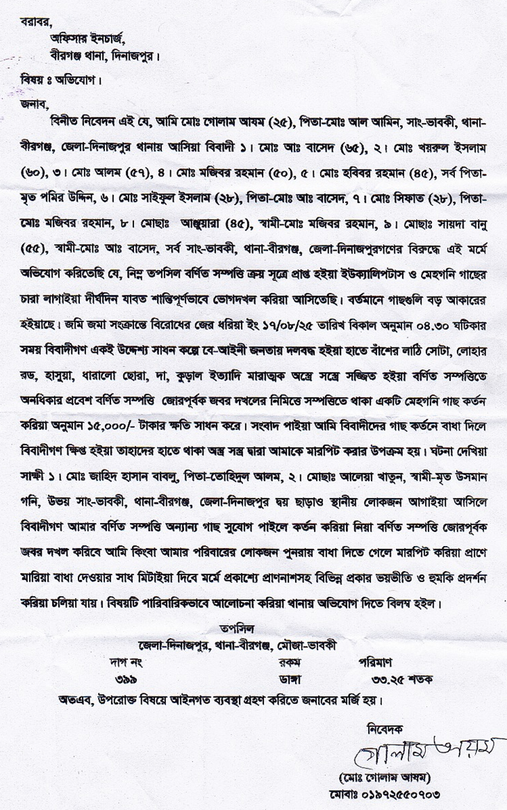 অভিযোগ সূত্রে জানা যায়, ক্রয়কৃত সম্পত্তিতে ইউক্যালিপটাস ও মেহগনি গাছ রোপন করে দীর্ঘদিন ধরে শান্তিপূর্ণভাবে ভোগদখল করে আসছেন মোঃ গোলাম আযম। ১৭ আগস্ট বিকালে আনুমানিক সাড়ে চারটার দিকে একই এলাকার মোঃ আব্দুল বাসেদসহ ৯ জন বিবাদী হাতুড়ি, দা, কুড়াল, লোহার রড, বাঁশের লাঠিসোটা ও ধারালো অস্ত্রশস্ত্রে সজ্জিত হয়ে জোরপূর্বক ওই জমিতে প্রবেশ করেন। এ সময় তারা জবরদখলের উদ্দেশ্যে মেহগনি গাছ কেটে ক্ষতি সাধন করেন।