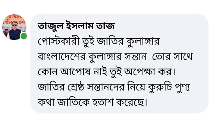 জুলাই বিপ্লবের পর এক জুলাই যোদ্ধা খুনি হাসিনাকে ‘মাফিয়া রাণি’ বলে সম্মোধন করে তার বিচার দাবি করলে সন্ত্রাসী তাজ জুলাই যোদ্ধাকে হুমকি দিয়ে বলে,