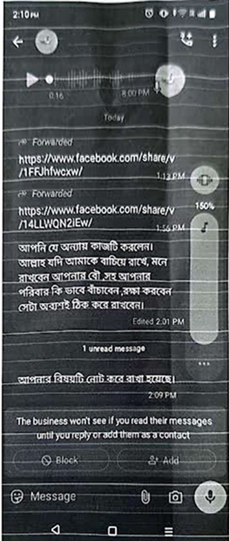 বৃহস্পতিবার দুপুর ২টা ১ মিনিট ও ২টা ৯ মিনিটে ওই হোয়াটসঅ্যাপ নম্বর থেকে পরপর দুটি বার্তা আসে। প্রথম বার্তায় লেখা ছিলো—