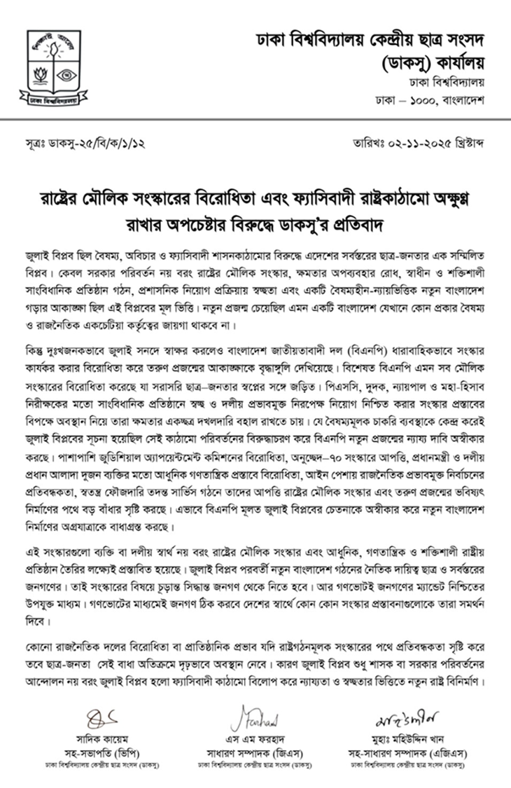 রাষ্ট্রের মৌলিক সংস্কারের বিরোধিতা এবং ফ্যাসিবাদী কাঠামো টিকিয়ে রাখার অপচেষ্টার বিরুদ্ধে কঠোর প্রতিবাদ জানিয়েছে ঢাকা বিশ্ববিদ্যালয় কেন্দ্রীয় ছাত্র সংসদ (ডাকসু)।