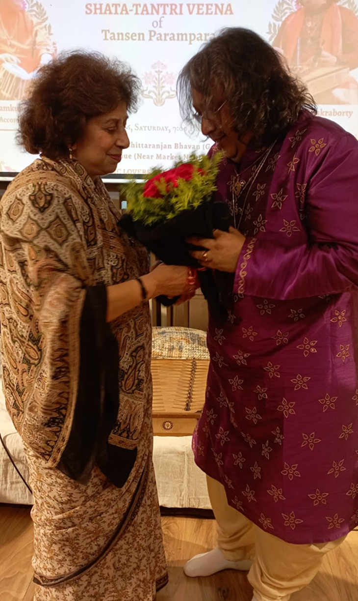 মিষ্টি সুর ছড়িয়ে নিস্তব্ধতাকে আড়াল করে ঝংকার ছড়াচ্ছিলো শততন্ত্রী বীণা। দিল্লীর বাঙ্গালী পাড়া সিআর পার্কে দেশবন্ধু চিত্তরঞ্জন ভবন মেম্বার্স লাউঞ্জে গত ৪ এপ্রিল আয়োজিত ‘এ সলো মিউজিক্যাল জার্নি শততন্ত্রী বীণা অফ তানসেন পরমম্পরা’ অনুষ্ঠানে দর্শকরা মুহূর্তের জন্যও চোখ ফেলার সুযোগ পেলেন না।