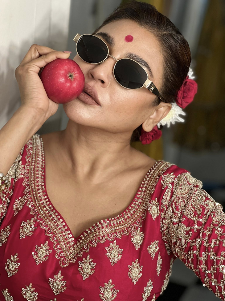 ছবিতে আরও দেখা যায় জয়ার কপালে লাল টিপ, মাথায় লাল-সাদা গোলাপের সাজ এবং চোখে স্টাইলিশ রোদচশমা। হাতে পাথরের তৈরি চুড়ি ও বালা এ লুককে করেছে আরও আভিজাত্যপূর্ণ। কিন্তু সবচেয়ে আলোচ্য বিষয় হলো তার হাতে থাকা টুকটুকে লাল আপেল।