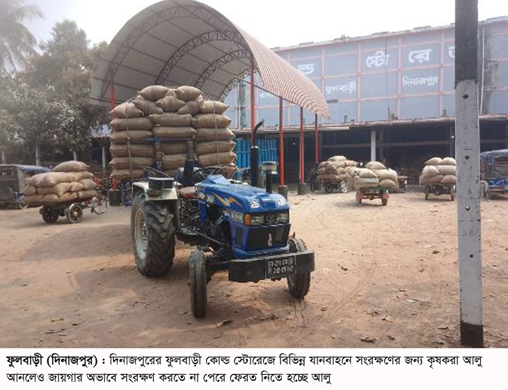 সরেজমিনে দিনাজপুরের ফুলবাড়ী কোল্ডস্টোরেজে গিয়ে দেখা যায়, স্টোরেজের ভেতরে অন্তত শতাধিক ট্রাক্টর, ভটভটি ও ব্যাটারিচালিত ভ্যানভর্তি আলু নিয়ে হিমাগারে ঢোকানোর জন্য এসেছেন বিভিন্ন এলাকার কৃষকরা। কিন্তু স্টোরেজে এসে জায়গার অভাবে চোখেমুখে হতাশার ছাপ নিয়ে ফিরতে হচ্ছে বাড়ীতে।