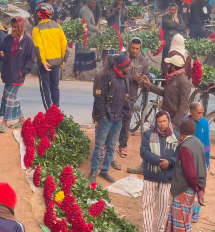 শীত উপেক্ষা করে কাকডাকা ভোর থেকে মহাসড়কের দু’পাশে জমে ওঠে রঙের হাট। ফুলচাষিরা বাইসাইকেল, ভ্যান, বা মোটরসাইকেলের পেছনে করে নিয়ে এসেছেন তাজা গোলাপ, জারবেরা, গাঁদা, গ্ল্যাডিওলাস আর রজনীগন্ধার সুবিশাল পসরা। দূর-দূরান্ত থেকে আসা পাইকারদের হাঁকডাক, দর কষাকষি আর ফুলের সুবাসে বাতাস হয়ে ওঠে ম ম। এটি শুধু একটি বাজার নয়, এ যেন জাতীয় উৎসবের ডালি সাজানোর এক বিশাল কর্মযজ্ঞ।