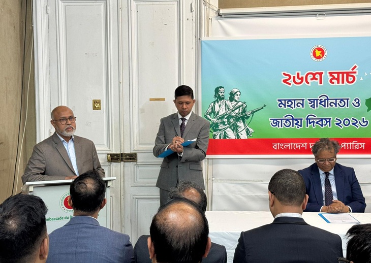 বৃহস্পতিবার (২৬ মার্চ) সকালে বাংলাদেশ দূতাবাস, প্যারিসের নিজস্ব কার্যালয়ের হলরুমে আয়োজিত অনুষ্ঠানে বক্তব্য রাখেন ইউনেস্কোতে বাংলাদেশের স্থায়ী প্রতিনিধি এবং ফ্রান্স ও মোনাকোতে নিযুক্ত বাংলাদেশের রাষ্ট্রদূত খন্দকার এম. তালহা।
