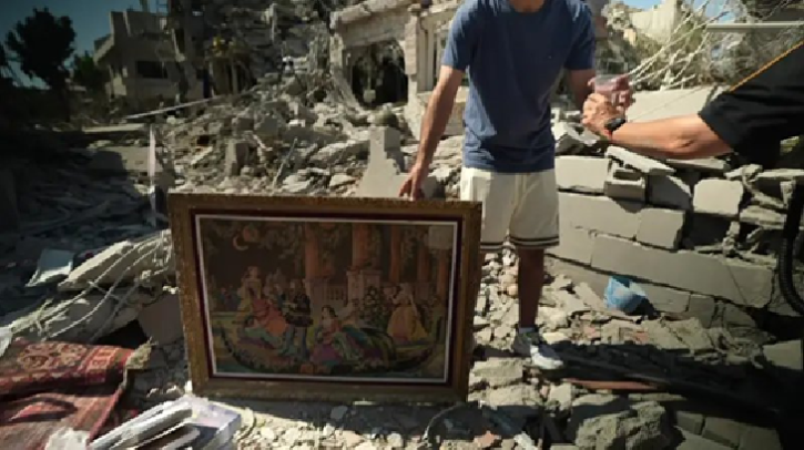 এক ব্যক্তি উদ্ধার করেছেন একটি অক্ষত তেলচিত্র—বোমার আঘাতেও যেটি যেন অলৌকিকভাবে রক্ষা পেয়েছে। কাঁধে সে চিত্র নিয়ে তিনি যখন ভাঙা রাস্তায় হাঁটছিলেন, তখন তাঁকে ঘিরে জমে উঠেছিলো এক নিঃশব্দ শোক।
