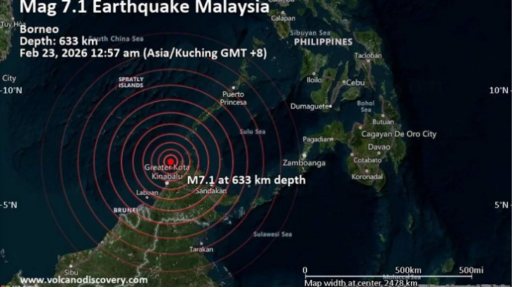 মালয়েশিয়া-এর বোর্নিও দ্বীপের সাবাহ অঙ্গরাজ্যের উপকূলে ৭.১ মাত্রার শক্তিশালী ভূমিকম্প অনুভূত হয়েছে। ভূমিকম্পটি সোমবার (২৩ ফেব্রুয়ারি) রাত ১২টা ৫৭ মিনিটে স্থানীয় সময় শুরু হয়।