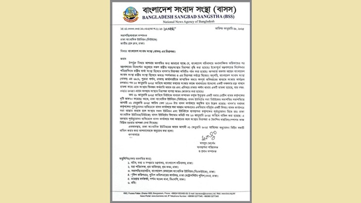 বাংলাদেশ সংবাদ সংস্থার (বাসস) ব্যবস্থাপনা পরিচালকের দেওয়া আপত্তিকর ও ঔদ্ধত্যপূর্ণ চিঠি ৭২ ঘণ্টার মধ্যে দুঃখপ্রকাশ করে প্রত্যাহারের আলটিমেটাম দিয়েছে ঢাকা সাংবাদিক ইউনিয়ন (ডিইউজে)।