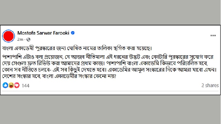 পোস্টে তিনি লেখেন, বাংলা একাডেমি পুরস্কারের জন্য ঘোষিত নামের তালিকা স্থগিত করা হয়েছে। পাশাপাশি এটাও বলা প্রয়োজন, যে আজব নীতিমালা এ ধরনের উদ্ভট এবং কোটারি পুরস্কারের সুযোগ করে দেয় সেগুলো দ্রুত রিভিউ করা আমাদের প্রথম কাজ।