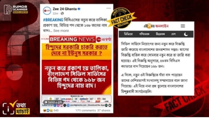 ৪৩তম বিসিএসের নতুন প্রজ্ঞাপনে বাদ পড়া ১৬৮ জনের অধিকাংশই হিন্দু ধর্মাবলম্বী, এমন দাবিটি ভারতের গণমাধ্যমে প্রচারিত হওয়ার পর, ফ্যাক্টচেকিং প্ল্যাটফর্ম রিউমর স্ক্যানার বাংলাদেশ এর সত্যতা অস্বীকার করেছে।
