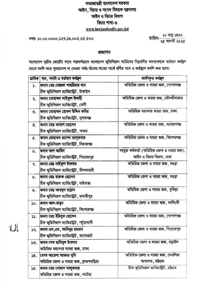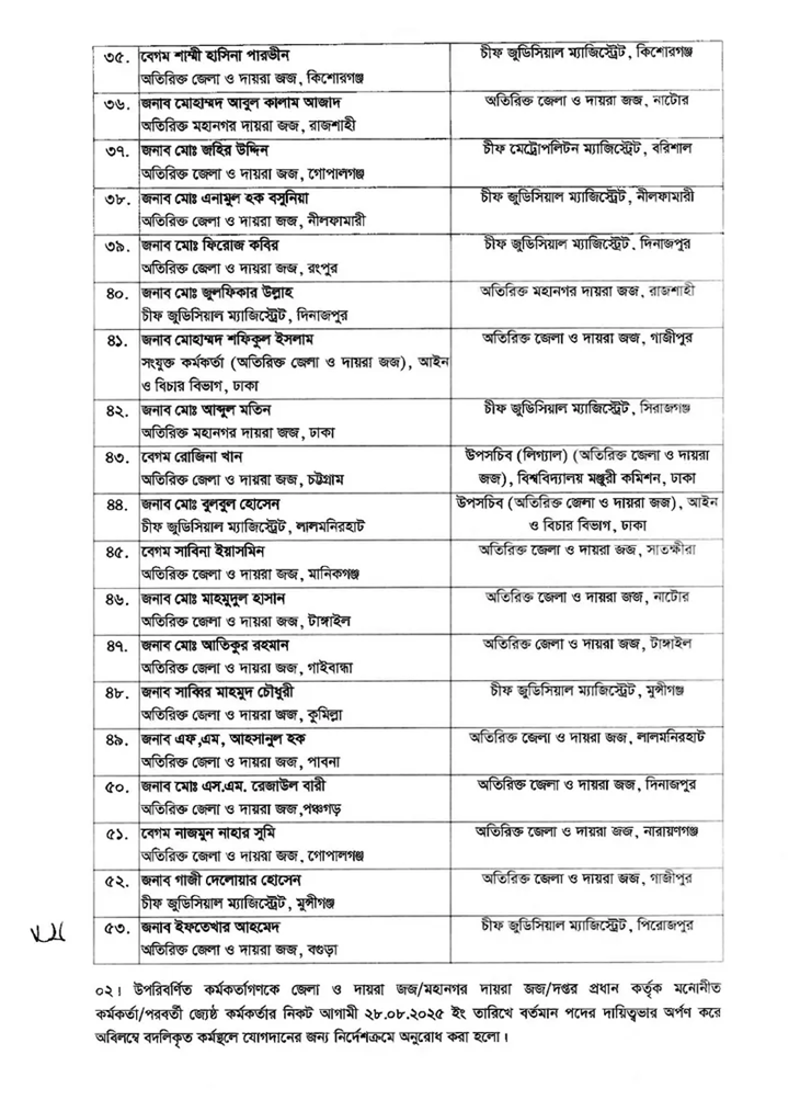 প্রজ্ঞাপনে বদলিকৃত বিচারকদের নতুন কর্মস্থলের তালিকা উল্লেখ করা হয়েছে। আইন মন্ত্রণালয় জানায়, বিচার বিভাগের কার্যক্রমে গতি আনা এবং প্রশাসনিক প্রয়োজনেই এ রদবদল করা হয়েছে। বিস্তারিত তালিকা নিম্নরূপ: