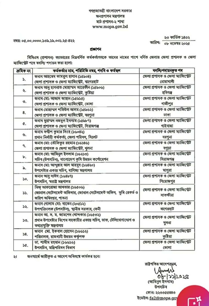 দেশের ১৫ জেলায় নতুন ডিসি নিয়োগ