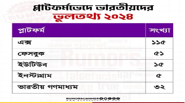 এক্স ছাড়াও বাংলাদেশকে নিয়ে গত বছর ফেসবুকে ভারতীয় বিভিন্ন অ্যাকাউন্ট ও পেজ থেকে অর্ধশতাধিক অপতথ্যের প্রচার করা হয়েছে। অপতথ্য প্রচারের তালিকায় আছে ইউটিউব এবং ইনস্টাগ্রামের নামও। এমনকি ভারতীয় গণমাধ্যমও অন্তত ৩২টি ঘটনায় অপতথ্য প্রচার করেছে।