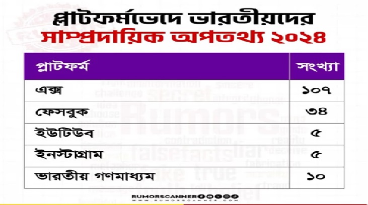 গত বছর ভারতীয়দের ছড়ানো যে ১৪৮টি অপতথ্য শনাক্ত করেছে রিউমর স্ক্যানার, তার মধ্যে ১১৫টিই সাম্প্রদায়িক অপতথ্য। গেল বছর সাম্প্রদায়িক অপতথ্যের প্রচারের বড় এক মাধ্যম হয়ে ওঠে এক্স। আগস্ট মাসেই এক্সে ৫১টি সাম্প্রদায়িক অপতথ্য শনাক্ত করে রিউমর স্ক্যানার।