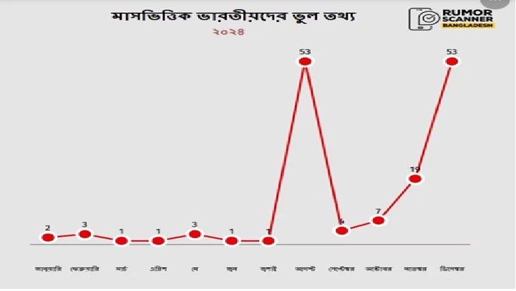 গেল কয়েক বছর ধরেই সোশ্যাল মিডিয়ায় ভারতীয় বিভিন্ন অ্যাকাউন্ট, পেজসহ সে দেশের মূল ধারার গণমাধ্যমগুলো বাংলাদেশকে জড়িয়ে নিয়মিত ভুল তথ্য প্রচার করে আসছে। ২০২৪ সালের প্রথম ছয় মাসেও এ প্রবণতা নিয়মিত ঘটনা হিসেবে লক্ষ্য করছিল রিউমর স্ক্যানার। তবে পরের মাস অর্থাৎ আগস্টে বাংলাদেশে ক্ষমতার পালাবদলের সুযোগ নিয়ে ভারতীয়দের অপপ্রচার কয়েকগুণ বেড়ে যায়৷ প্রথম ছয় মাসে মাত্র ১২টি অপতথ্য ছড়ালেও আগস্টে এক মাসেই প্রচার হয়েছে ৫৩টি অপতথ্য। পরের তিন মাস কিছুটা কমলেও ডিসেম্বরে বাংলাদেশ সম্মিলিত সনাতনী জাগরণ জোটের মুখপাত্র চিন্ময় কৃষ্ণ দাস গ্রেফতার ইস্যুতে ভর করে ফের আগস্টের মতো একই সংখ্যক (৫৩) অপতথ্য প্রচার করেছে ভারতীয়রা।