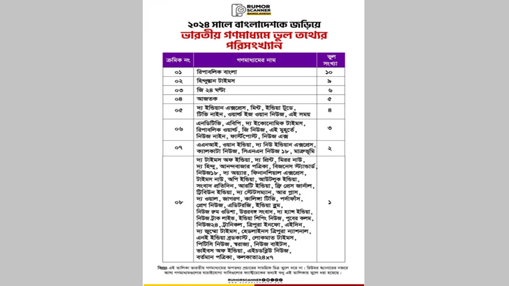 রিউমর স্ক্যানার ২০২৪ সালে ভারতীয় গণমাধ্যমে প্রচারিত ভুল তথ্য নিয়ে প্রকাশিত ফ্যাক্টচেকগুলো বিশ্লেষণ করে ৩২টি ঘটনায় দেশটির ৭২টি সংবাদমাধ্যমের প্রতিবেদনে বাংলাদেশকে জড়িয়ে ভুল তথ্য প্রচার হতে দেখেছে। এ সংবাদমাধ্যমগুলোতে সর্বোচ্চ ১০টি থেকে সর্বনিম্ন একটি ভুল তথ্য সম্বলিত প্রতিবেদন খুঁজে পাওয়া গেছে। ৭২টি সংবাদমাধ্যমে থাকা ১৩৭টি প্রতিবেদন যাচাই করে ভুল তথ্য প্রচারের প্রমাণ মিলেছে।