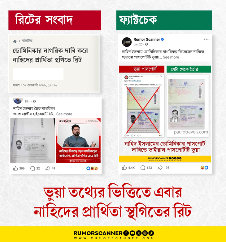 তবে স্বাধীন ফ্যাক্টচেকার রিউমর স্ক্যানার বলছে, এ অভিযোগের ভিত্তি ‘ভুয়া তথ্য’। তাদের অনুসন্ধানে দেখা গেছে, নাহিদ ইসলামের নামে প্রচারিত ডোমিনিকার পাসপোর্টটি আসল নয়। এটি মূলত অনলাইনে পাওয়া একটি নমুনা পাসপোর্টের ছবি ব্যবহার করে তৈরি করা হয়েছে। পাসপোর্টের ছবিতে নাহিদ ইসলামের মুখ ও স্বাক্ষর ডিজিটাল প্রযুক্তির মাধ্যমে বসানো হয়েছে।