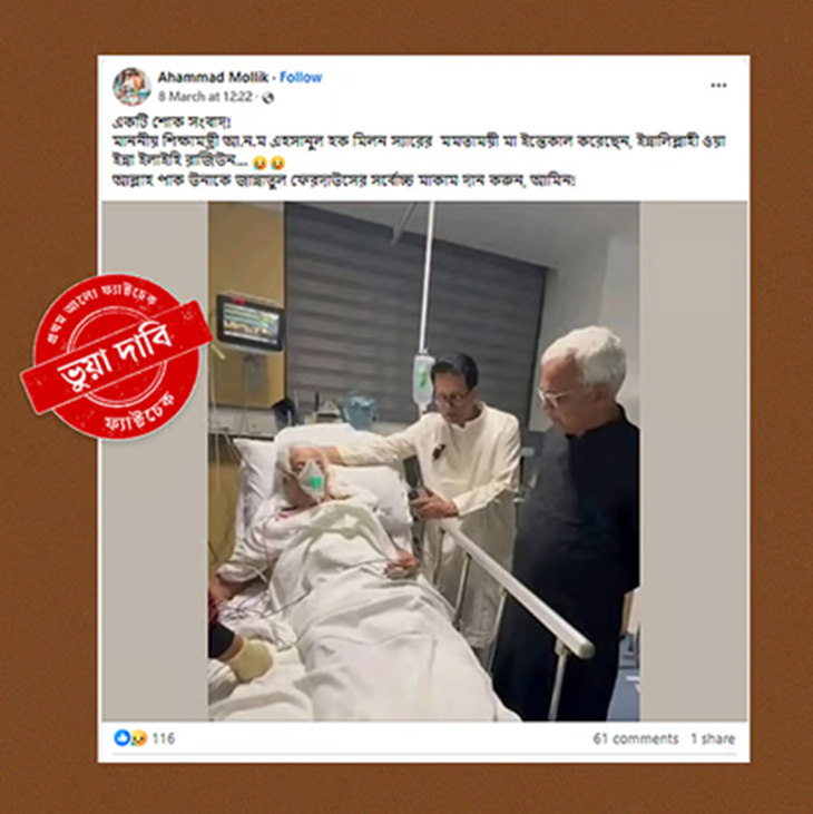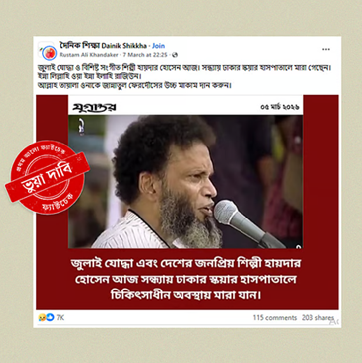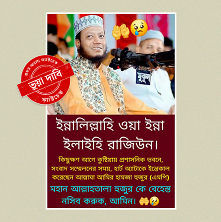 কিন্তু এর মধ্যেই সোশ্যাল মিডিয়ায় একটি ভুয়া ফটোকার্ড ছড়িয়ে পড়ে, যেখানে দাবি করা হয়—তিনি মারা গেছেন। যাচাই করে দেখা গেছে, এটি কোনও গণমাধ্যমের প্রকাশিত খবর নয়। বরং একটি আসল ফটোকার্ড সম্পাদনা করে ভুয়া শিরোনাম বসানো হয়েছে।