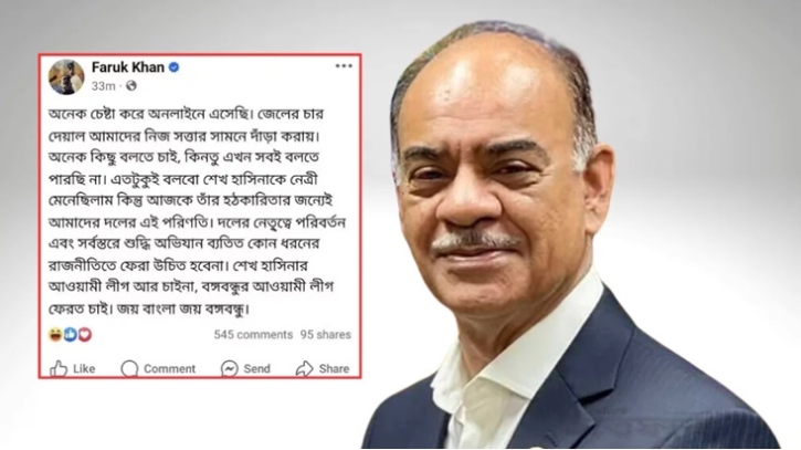 ফারুক খানের ভেরিফায়েড ফেসবুক অ্যাকাউন্টে তিনি লিখেছেন, অনেক চেষ্টা করে অনলাইনে এসেছি। জেলের চার দেয়াল আমাদের নিজ সত্তার সামনে দাঁড়া করায়। অনেক কিছু বলতে চাই, কিন্তু এখন সবই বলতে পারছি না। এতটুকুই বলবো, শেখ হাসিনাকে নেত্রী মেনেছিলাম, কিন্তু আজকে তার হঠকারীতার জন্যই আমাদের দলের এই পরিণতি। দলের নেতৃত্বে পরিবর্তন এবং সর্বস্তরে শুদ্ধি অভিযান ব্যতীত কোনও ধরনের রাজনীতিতে ফেরা উচিত হবে না। শেখ হাসিনার আওয়ামী লীগ আর চাই না। বঙ্গবন্ধুর আওয়ামী লীগ ফেরত চাই। জয় বাংলা জয় বঙ্গবন্ধু।
