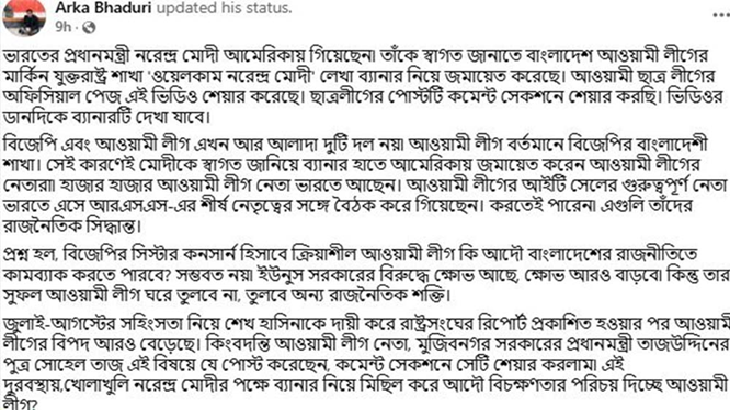 বিজেপি এবং আওয়ামী লীগ এখন আর আলাদা দুটি দল নয়। আওয়ামী লীগ বর্তমানে বিজেপির বাংলাদেশি শাখা। সে কারণেই মোদিকে স্বাগত জানিয়ে ব্যানার হাতে আমেরিকায় জমায়েত করেন আওয়ামী লীগের নেতারা।